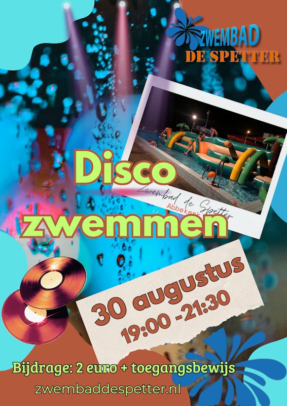 Kom swingen en zwemmen bij Zwembad De Spetter tijdens het discozwemmen. Vrolijke muziek en een coole stormbaan in het water regelen wij. Ook is er warme chocomel om aan het eind van de avond lekker warm te blijven.