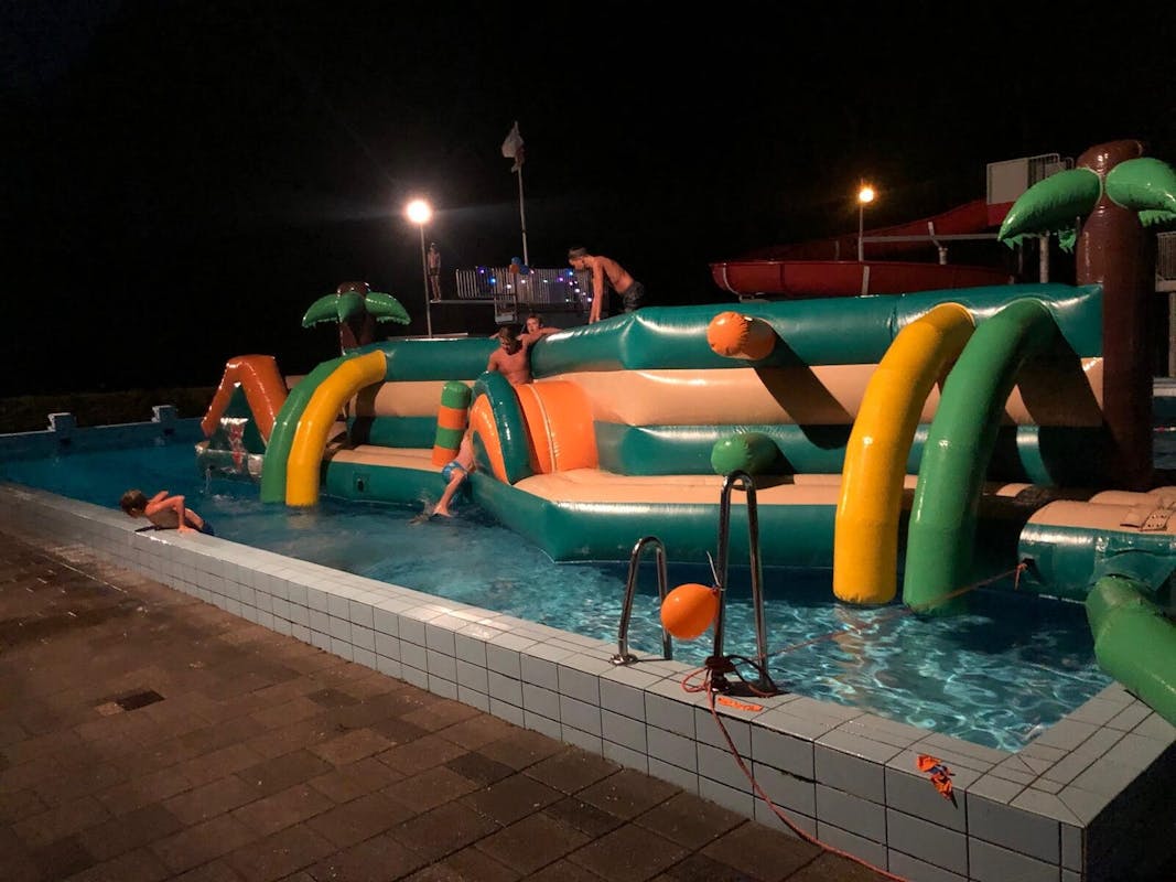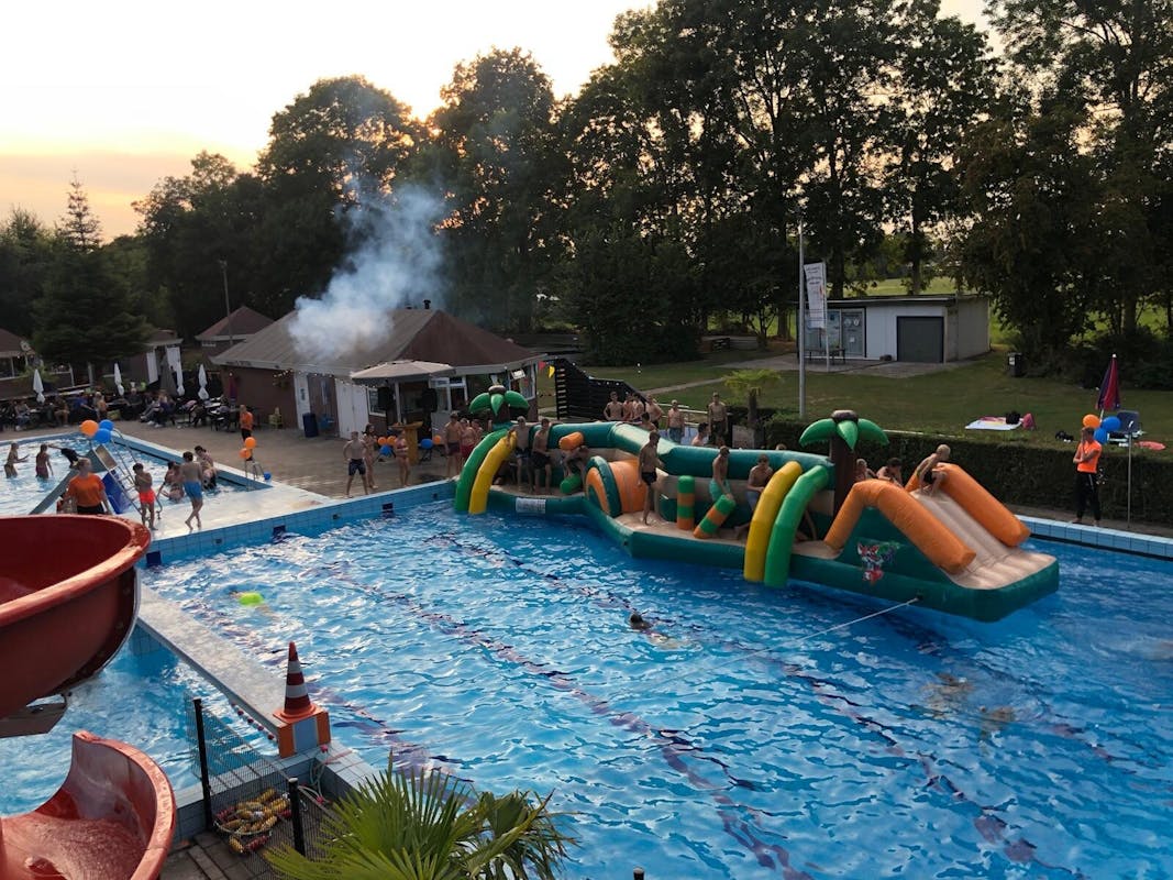 Een verwarmd buitenzwembad met -25 meter bad -recreatiebad -peuterbad -groot speelveld -en een GIGA-super glijbaan...