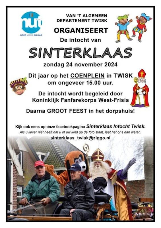 De intocht is dit jaar op het Coenplein in Twisk. Rond 15 uur zal de Sint arriveren.