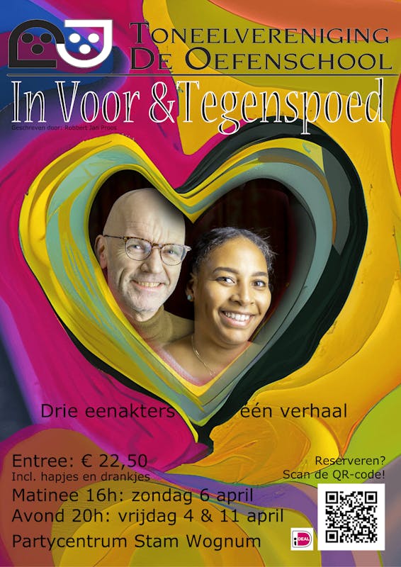 Toneelvereniging de Oefenschool speelt een tragi-komisch drieluik. Twee maanden geleden hebben Karlijn en Michel elkaar ontmoet via Tinder en vrij kort erna besloten te gaan trouwen. Daar vindt de omgeving wat van! In deze leuke, ontroerende en vooral herkenbare voorstelling zien we hoe vrienden, familie en ook de ambtenaar van de burgerlijke stand omgaan met dit voornemen. Kaarten voor deze beleving (deze zijn incl. hapjes en 3 drankjes) kunt u reserveren via de website www.oefenschool.nl of maak gebruik van de QR code op de affiche.