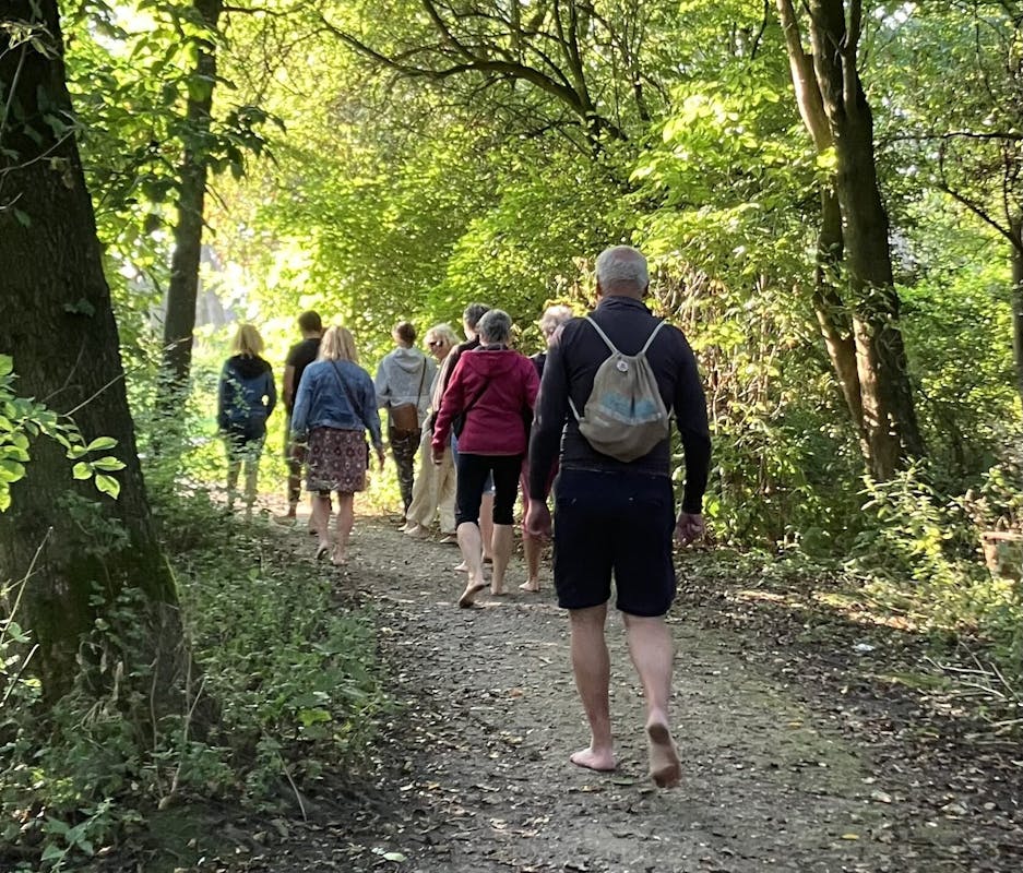 Je loopt over gras, zand en bospaden; met aandacht voor jezelf en de natuur.