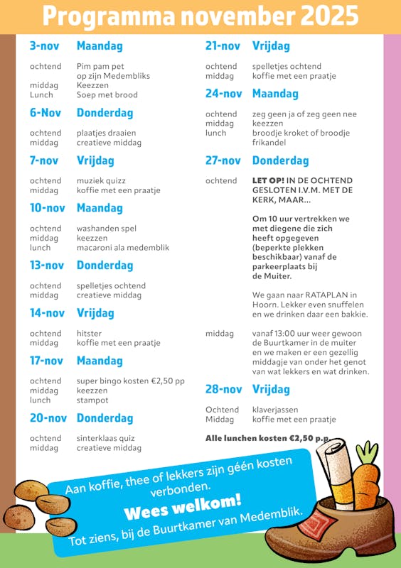 🌞 Activiteitenrooster – Augustus 2025 Buurtkamer Medemblik Welkom bij het activiteitenoverzicht van augustus! De zomer is nog in volle gang, en dat vieren we samen met leuke...