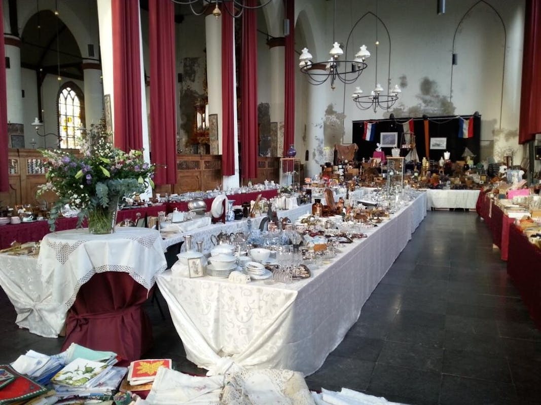 De Antiek, Brocante & Curiosamarkt biedt een unieke kans om uit een breed scala aan prachtige artikelen de meest bijzondere stukken te kopen en tegelijkertijd bij te dragen aan de restauratie van de prachtige monumentale kerk.