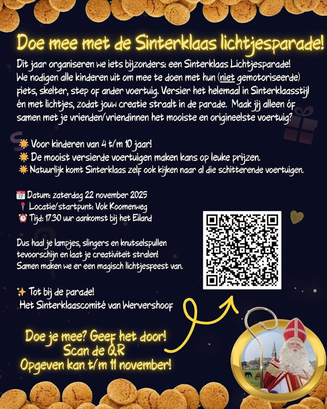 Dit jaar organiseren we iets bijzonders: een Sinterklaas Lichtjesparade! We nodigen alle kinderen uit om mee te doen met hun (niet gemotoriseerde) fiets, skelter, step of ander voertuig. Versier het helemaal in Sinterklaasstijl én met lichtjes, zodat jouw creatie straalt in de parade.