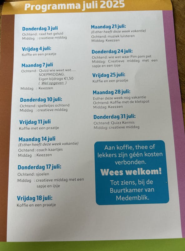 De maand juli staat weer vol met gezellige, creatieve en verbindende activiteiten. Of je nu graag spelletjes speelt, creatief bezig bent of gewoon zin hebt in een praatje bij de koffie β er is voor ieder wat wils!