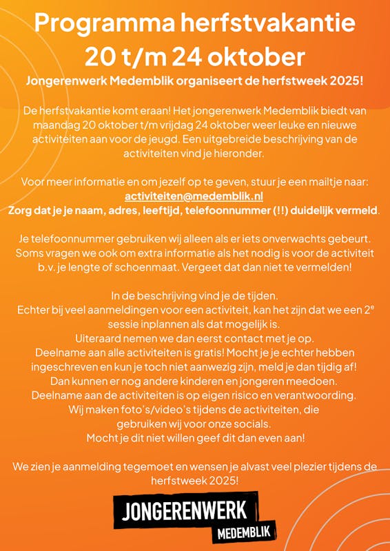 De herfstvakantie komt eraan! Het jongerenwerk Medemblik biedt van maandag 20 oktober t/m vrijdag 24 oktober weer leuke en nieuwe activiteiten aan voor de jeugd. Een uitgebreide beschrijving van de activiteiten vind je hieronder.