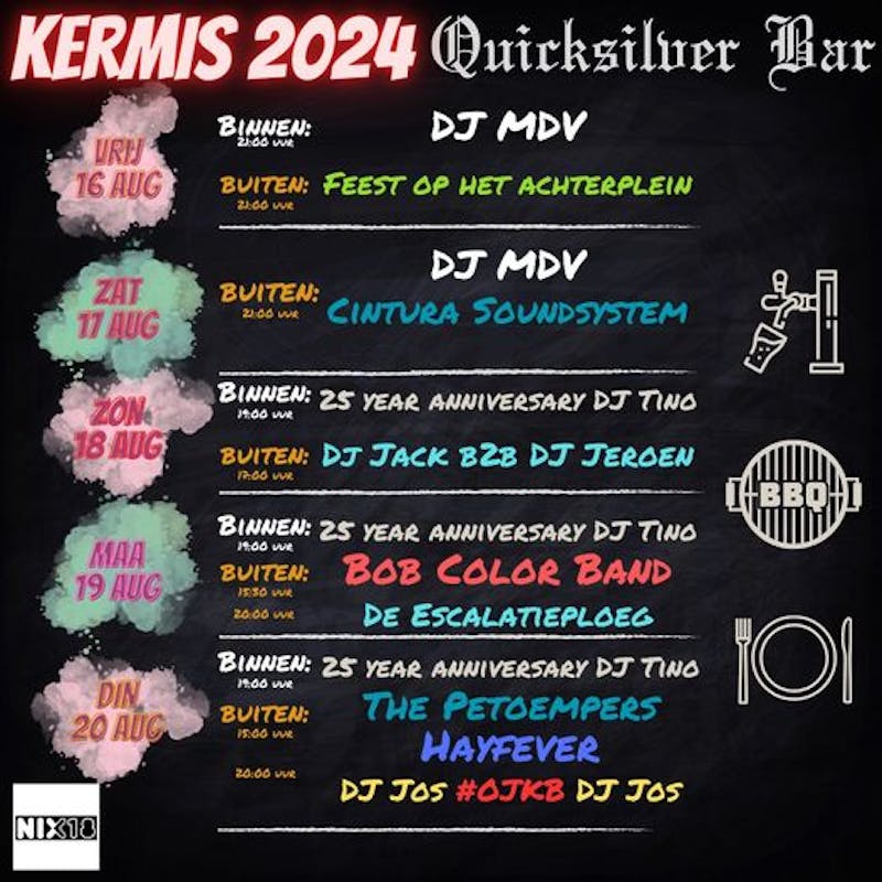 - Vrijdag 16 augustus: 21:00 DJ MDV en Feest op het Achterplein