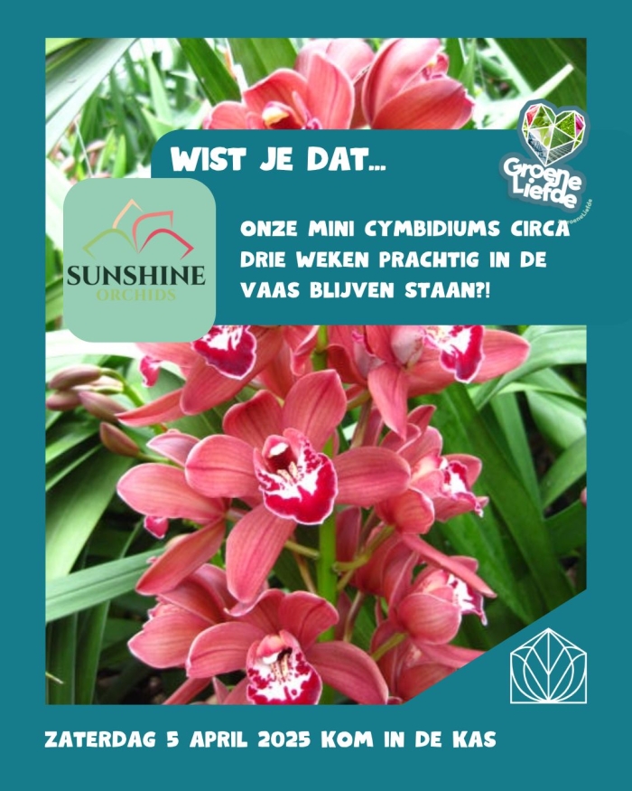 Sunshine Orchids is specialist in de teelt van Mini-Cymbidiums – een elegante en veelzijdige orchidee. Onze bloemen bloeien van september tot juni en we kweken meer dan 50 verschillende soorten Mini-Cymbidiums in diverse kleuren. Onze Mini-Cymbidiums staan niet alleen bekend om hun schoonheid, maar ook om hun indrukwekkende vaasleven van wel twee tot drie weken – een perfecte keuze voor bloemenliefhebbers die van lange bloei willen genieten.
