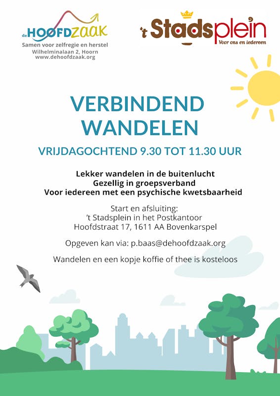 - Vrijdagochtend van 9.30 tot 11.30 uur vanuit ‘t Stadsplein (in het oude Postkantoor) in Bovenkarspel