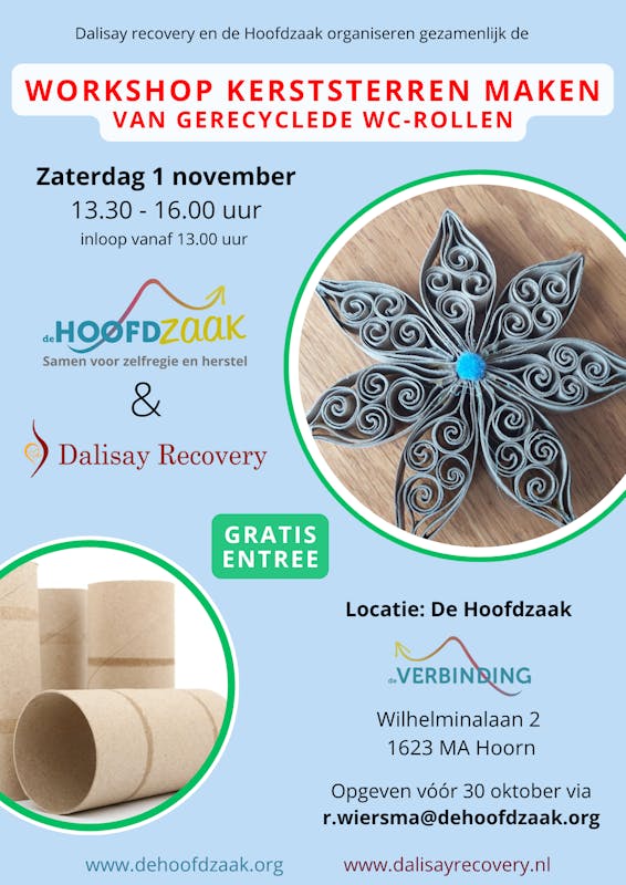 Op zaterdag 1 november is er om 13.30 uur weer een creatieve workshop bij De Hoofdzaak in Hoorn. We gaan kerststerren maken van lege wc-rollen!